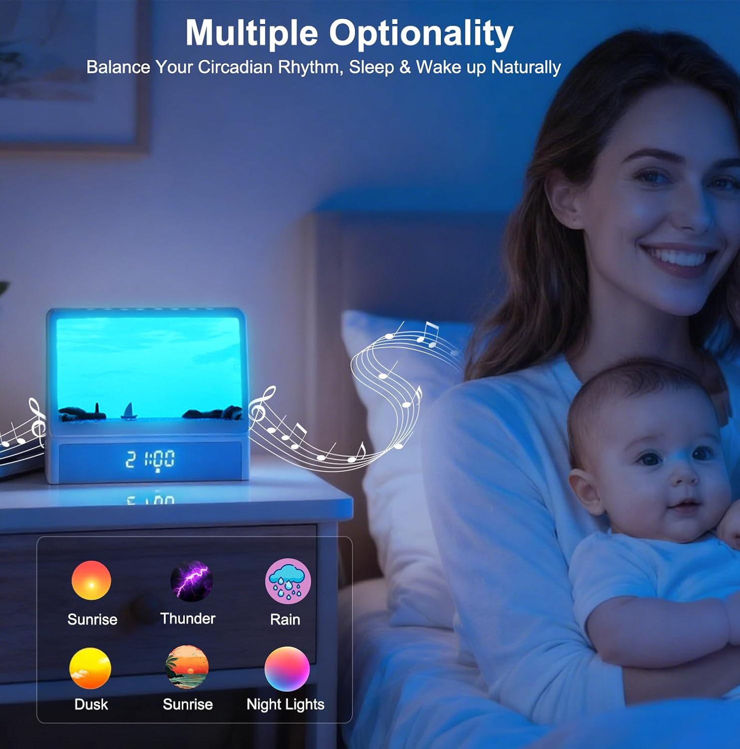 Sunset light with calming sounds like thunder, rain, and ocean signals your brain to sleep, while morning birds and gradual sunrise light wake you up naturally without any grogginess.
